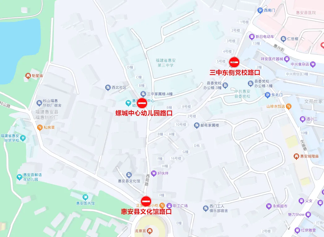 2、惠安三中管制點(diǎn):文化館路口、三中東側(cè)黨校路口、螺城中心幼兒園路口。