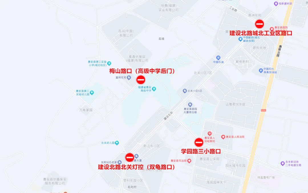 1、惠安一中管制點(diǎn):東南大街八馬茶葉對(duì)面、南陽路企塘花園路口、建設(shè)南路東南酒店、建設(shè)南路中國農(nóng)業(yè)銀行、建設(shè)南路東南大街路口、南陽路(公共廁所處)、建設(shè)南路往一中后門路口。