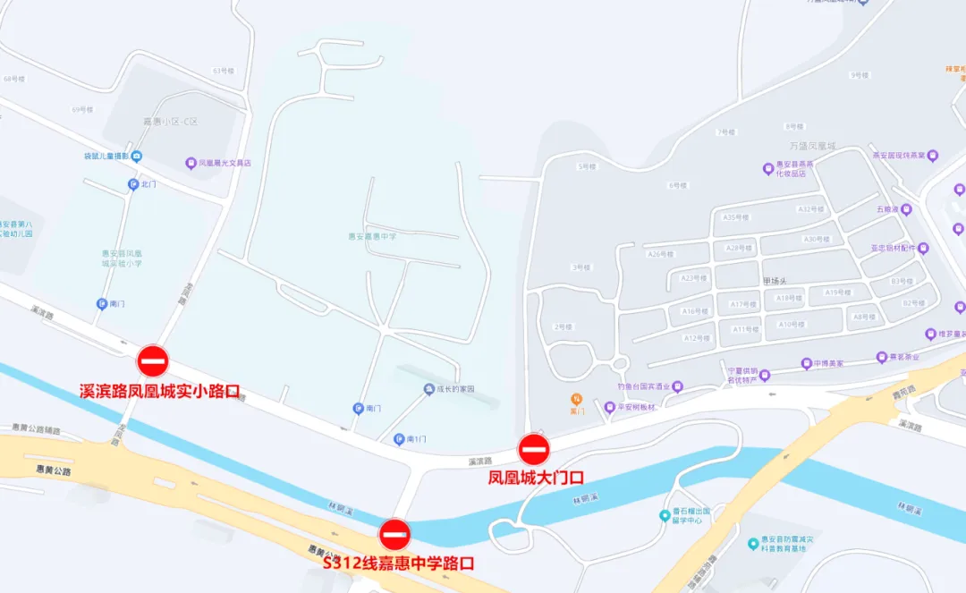 4、嘉惠中學(xué)管制點(diǎn):S312線嘉惠中學(xué)路口、鳳凰城大門口、溪濱路鳳凰城實(shí)小路口。