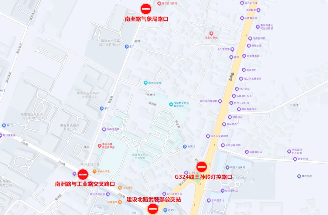 5、惠安職專管制點(diǎn):G324線王孫嶺燈控路口、建設(shè)北路武裝部公交站、南洲路氣象局路口、南洲路與工業(yè)路交叉路口。
