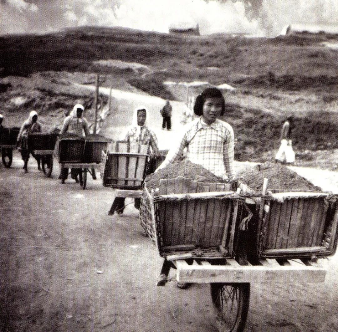 圖為惠女們用獨輪車為壩基運送土方