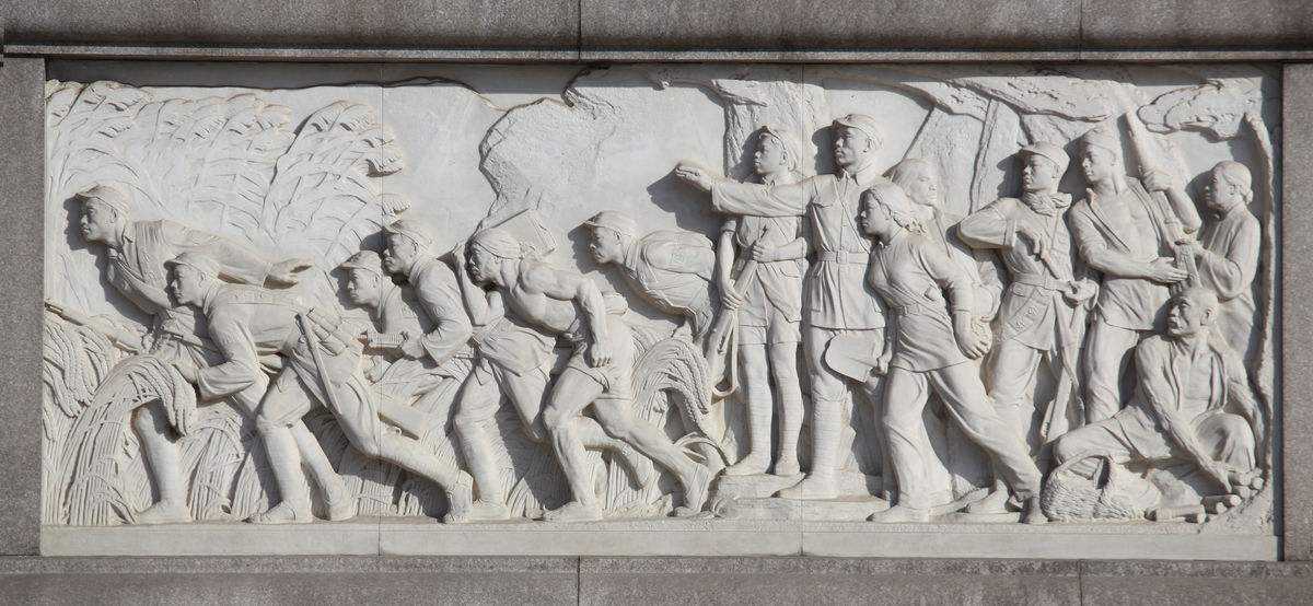 人民英雄紀(jì)念碑(Monument to the People's Heroes)位于北京天安門廣場(chǎng)中心,在天安門南約463米,正陽(yáng)門北約440米的南北中軸線上,是中華人民共和國(guó)政府為紀(jì)念中國(guó)近現(xiàn)代史上的革命烈士而修建的紀(jì)念碑。下層須彌座束腰部四面鑲嵌八幅巨大的漢白玉浮雕,分別以“虎門銷煙”、“金田起義”、“武昌起義”、“五四運(yùn)動(dòng)”、“五卅運(yùn)動(dòng)”、“南昌起義”、“抗日游擊戰(zhàn)爭(zhēng)”、“勝利渡長(zhǎng)江”為主題,在“勝利渡長(zhǎng)江”的浮雕兩側(cè),另有兩幅以“支援前線”、“歡迎中國(guó)人民解放軍”為題的裝飾性浮雕。浮雕高2米,總長(zhǎng)40.68米,浮雕鐫刻著170多個(gè)人物形象,生動(dòng)而概括地表現(xiàn)出中國(guó)人民100多年來(lái),特別是在中國(guó)共產(chǎn)黨領(lǐng)導(dǎo)下28年來(lái)反帝反封建的偉大革命斗爭(zhēng)史實(shí)。
