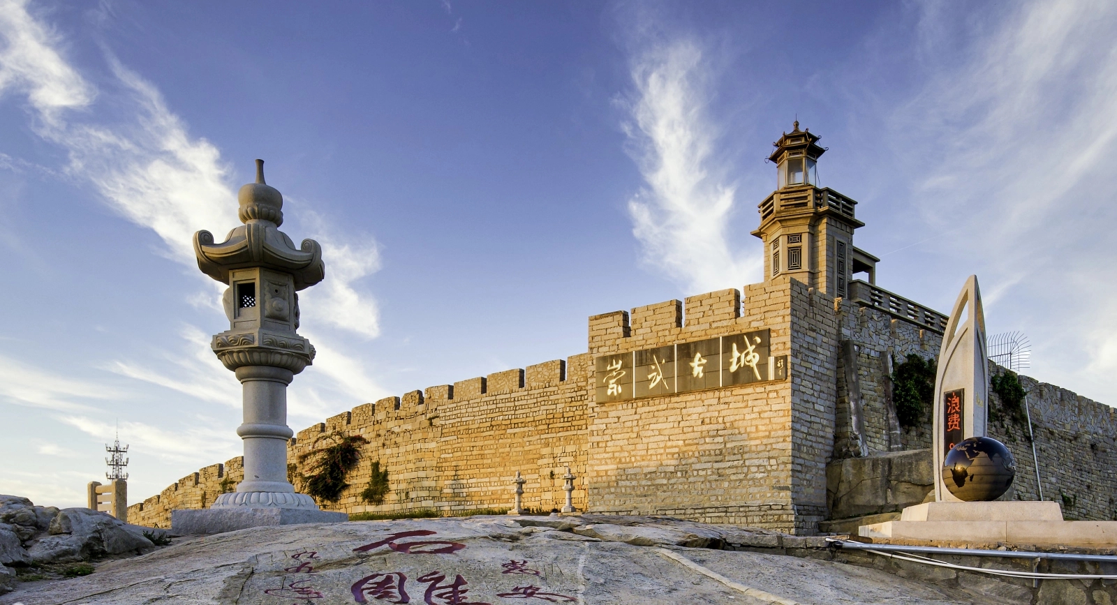 石雕映著晚霞和日落