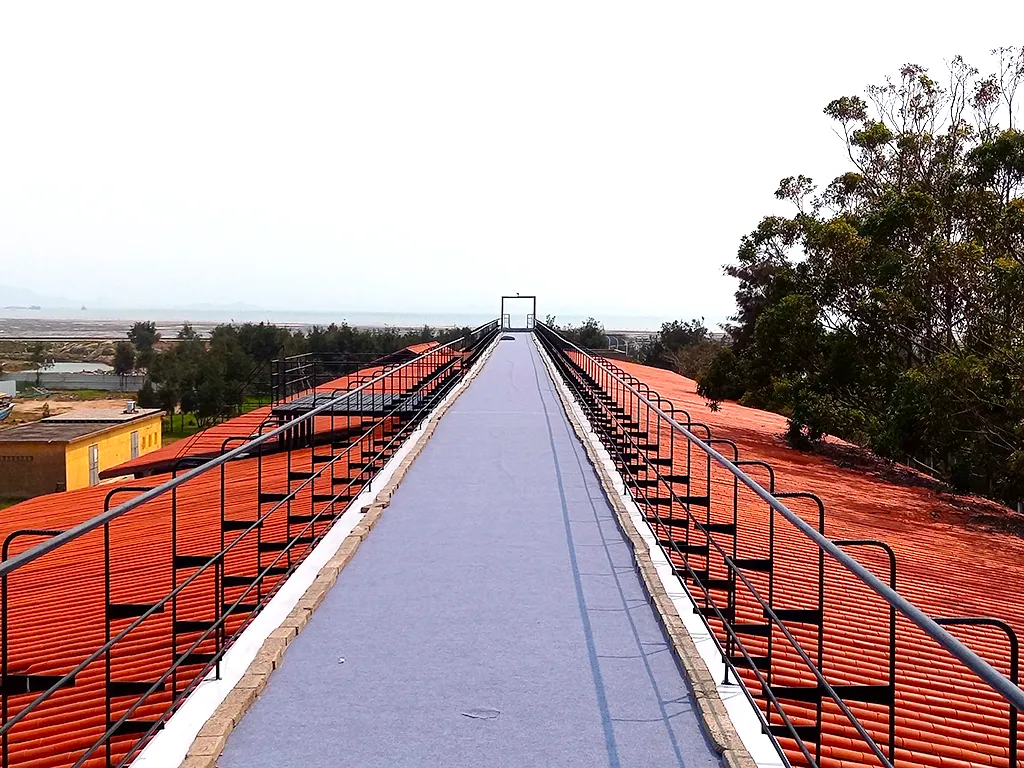 爬上屋頂?shù)?span style="-webkit-tap-highlight-color: transparent; margin-right: 0px; margin-left: 0px; padding: 0px; outline: 0px; max-width: 100%; color: rgb(63, 129, 176); box-sizing: border-box !important; overflow-wrap: break-word !important;">觀海棧道,映入眼簾的是美術(shù)館兩側(cè)屋頂上的“閩南紅”瓦片,在碧海藍(lán)天的襯托下顯得一片紅火,郁郁蔥蔥的綠樹也來“湊熱鬧”。長長的棧道仿佛直通大海,走到盡頭就是最佳觀海點(diǎn),來看看畫展、吹吹海風(fēng)、看看潮起潮落,將藍(lán)天碧海盡收眼底吧!