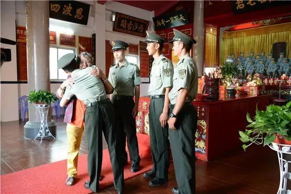 前來參觀解放軍廟的部隊(duì)官兵與曾恨深情擁抱
