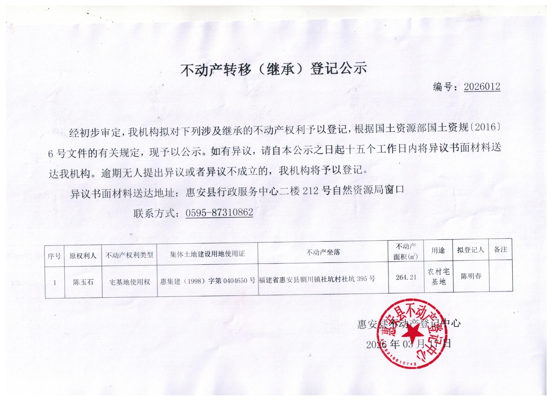 不動產(chǎn)轉(zhuǎn)移(繼承)登記公示2026012