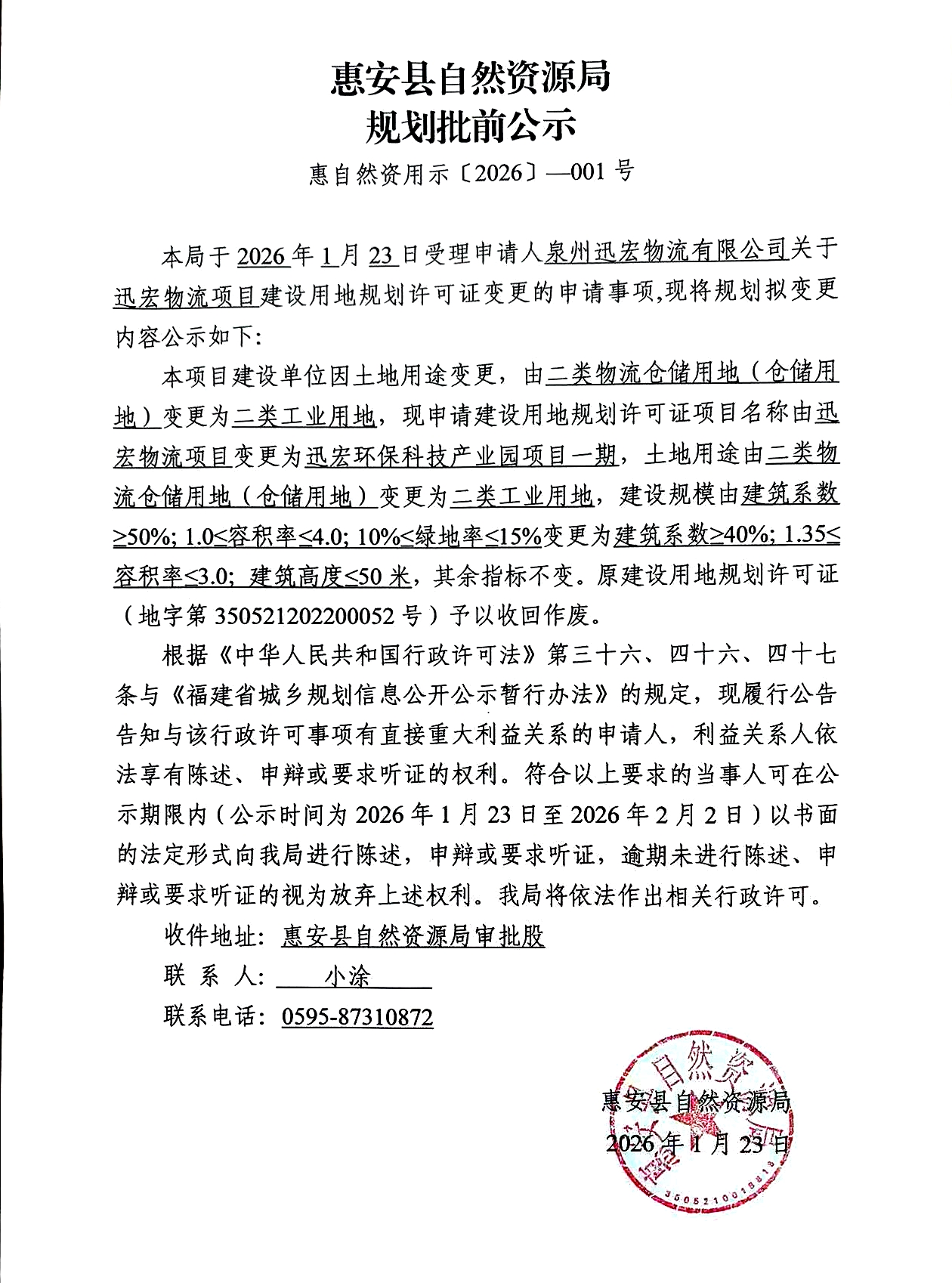 迅宏物流項(xiàng)目建設(shè)用地規(guī)劃許可證變更批前公示