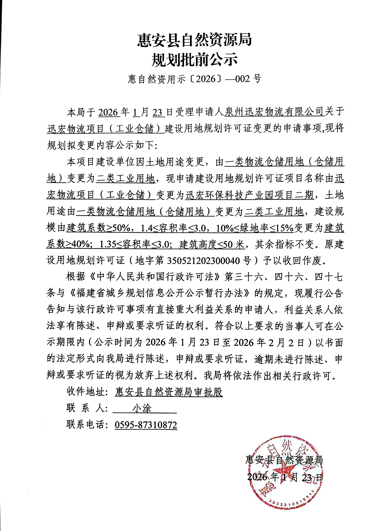 迅宏物流項(xiàng)目(工業(yè)倉(cāng)儲(chǔ))建設(shè)用地規(guī)劃許可證變更批前公示