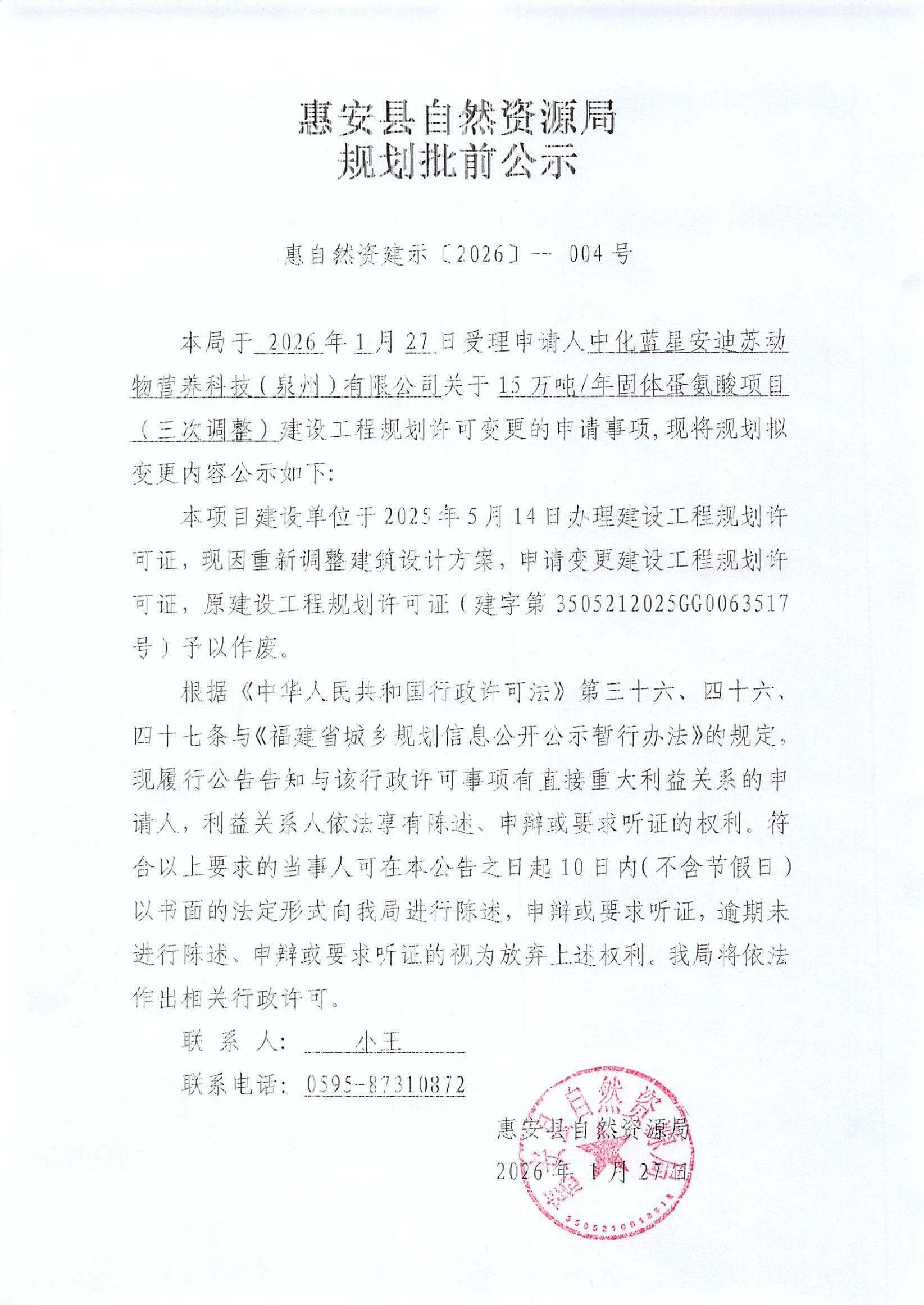 15萬噸/年固體蛋氨酸項目(三次調(diào)整)建設(shè)工程規(guī)劃許可變更批前公示