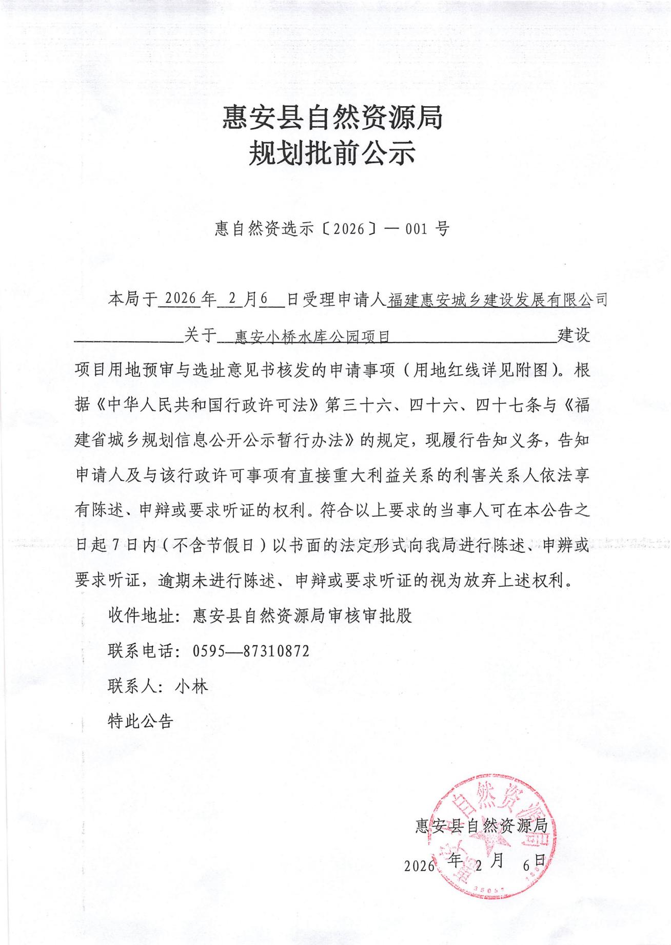 惠安小橋水庫公園項目建設(shè)項目用地預(yù)審與選址意見書規(guī)劃批前公示