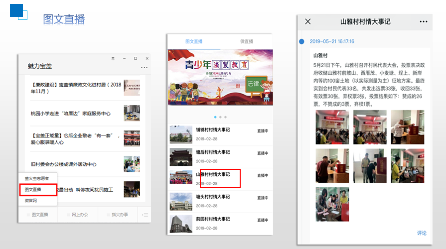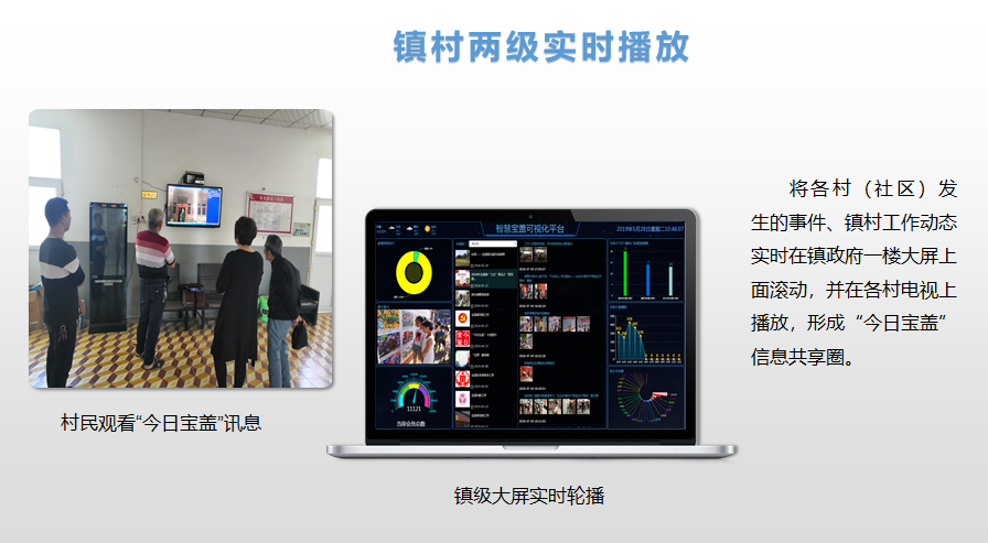 寶蓋鎮(zhèn)以“魅力寶蓋”公微號(hào)為基礎(chǔ),率先建成集圖文直播、網(wǎng)上辦證、安全生產(chǎn)監(jiān)管、績效系統(tǒng)、綜治入戶、黨建系統(tǒng)、鄉(xiāng)風(fēng)文明、線上直播等為一體的綜合信息化管理服務(wù)平臺(tái)——“智慧寶蓋”,促進(jìn)線上線下互動(dòng)融合,有力推動(dòng)基層政務(wù)公開與村(社區(qū))公開協(xié)同發(fā)展,讓政務(wù)服務(wù)更加陽光透明。設(shè)置 “村情大事記圖文直播”版塊,實(shí)時(shí)共享信息,進(jìn)一步增強(qiáng)與群眾互動(dòng)性,提高宣傳及時(shí)性,目前圖文直播會(huì)員已達(dá)26.5萬人;開設(shè)“寶蓋直播間”,通過群眾喜聞樂見的宣傳方式,有針對(duì)性地宣傳移風(fēng)易俗、“鄉(xiāng)風(fēng)文明”積分制等政策措施,及時(shí)收集和回應(yīng)相關(guān)輿情,做好新形勢(shì)下群眾工作。同時(shí),該鎮(zhèn)積極探索搭建可視化便民服務(wù)平臺(tái),通過與工作人員可視化通話來反饋需求與訴求,有效解決村內(nèi)老年人不熟悉智能手機(jī)操作的困境,目前可視化平臺(tái)已在抓緊建設(shè)中。
