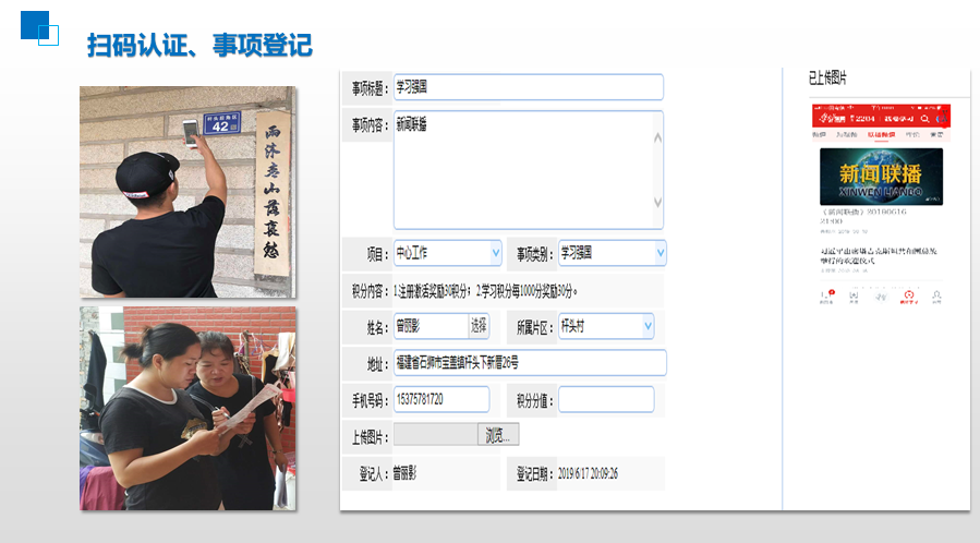寶蓋鎮(zhèn)基于二維碼門牌,建立村民自家門口“數(shù)字檔案”,為“智慧寶蓋”建設(shè)提供數(shù)據(jù)支撐。該鎮(zhèn)將信息收集權(quán)限下放至村級(jí),擴(kuò)大信息收集覆蓋面。鎮(zhèn)村兩級(jí)通過收集各家各戶信息,存入與二維碼門牌相關(guān)聯(lián)的數(shù)據(jù)庫,形成村民每戶家庭的“數(shù)字檔案”。開發(fā)與二維碼門牌關(guān)聯(lián)的“鄉(xiāng)風(fēng)文明”積分系統(tǒng),村民及時(shí)關(guān)注“魅力寶蓋”公微號(hào),通過個(gè)人申報(bào)、他人推薦和集體評(píng)議等方式上報(bào)善行公益、移風(fēng)易俗、表彰獎(jiǎng)勵(lì)等事項(xiàng),可獲得相應(yīng)積分用于實(shí)物兌換,其中積分達(dá)到一定名次其直系適齡兒童可就讀該鎮(zhèn)公辦幼兒園,極大地提高群眾參與鎮(zhèn)村管理的積極性。自去年6月份運(yùn)行以來,全鎮(zhèn)共完成認(rèn)證人數(shù)1.8萬人,村居認(rèn)證地址數(shù)5212個(gè),小區(qū)認(rèn)證地址數(shù)9476個(gè),占地址總數(shù)的91.2%;錄入事項(xiàng)59645個(gè),完成積分近600萬分,可兌換近60萬元。